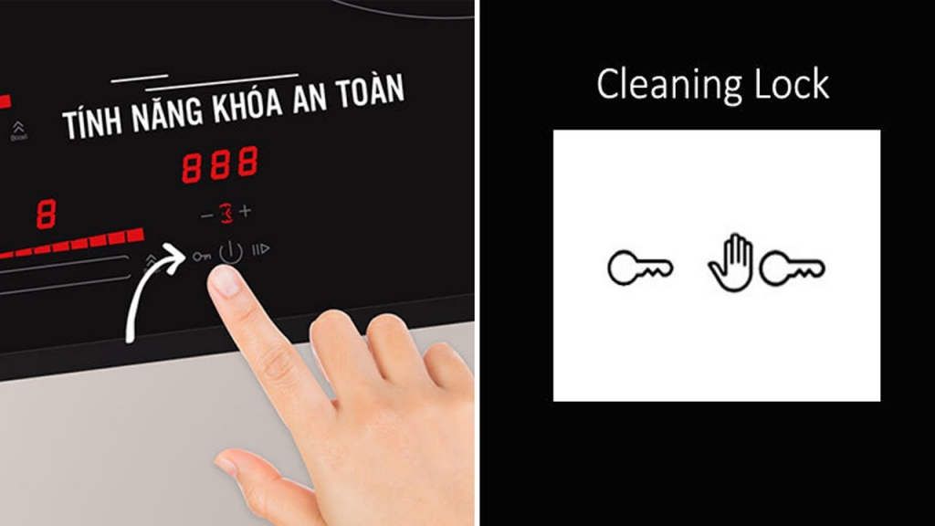 Cleaning lock cho bếp người dùng thoải mái vệ sinh bếp ngay cả khi đang sử dụng. Nhưng chức năng này khá hiếm, không phải dòng bếp từ nào cũng có. Nếu gia đình bạn sử dụng dòng sản phẩm này và vô tình khởi động chức năng này mà không biết cách mở, hãy thực hiện như sau: